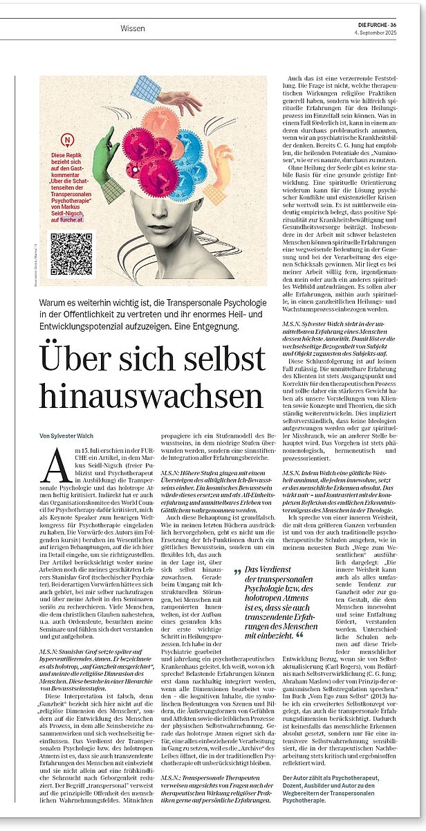 Im Zusammenhang mit dem kritisch formulierten Gastkommentar von Markus Seidl-Nigsch zur transpersonalen Psychologie und dem holotropen Atmen in der Zeitschrift Die Furche möchte ich mitteilen, dass ich in den vergangenen Wochen eine sehr konstruktive und wertschätzende Korrespondenz mit der Chefredakteurin Frau Mag. Doris Helmberger-Fleckl sowie intensive Gespräche mit dem Ressortleiter Dr. Martin Tauss führen durfte.