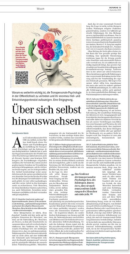 Am 5. September wurde meine Entgegnung unter dem Titel „Über sich selbst hinauswachsen“ veröffentlicht – in leicht überarbeiteter Form und mit dem einleitenden Gedanken: „Warum es wichtig ist, die Transpersonale Psychologie in der Öffentlichkeit zu vertreten und ihr enormes Entwicklungspotential aufzuzeigen.“ Den vollständigen Beitrag finden Sie weiter unten verlinkt.